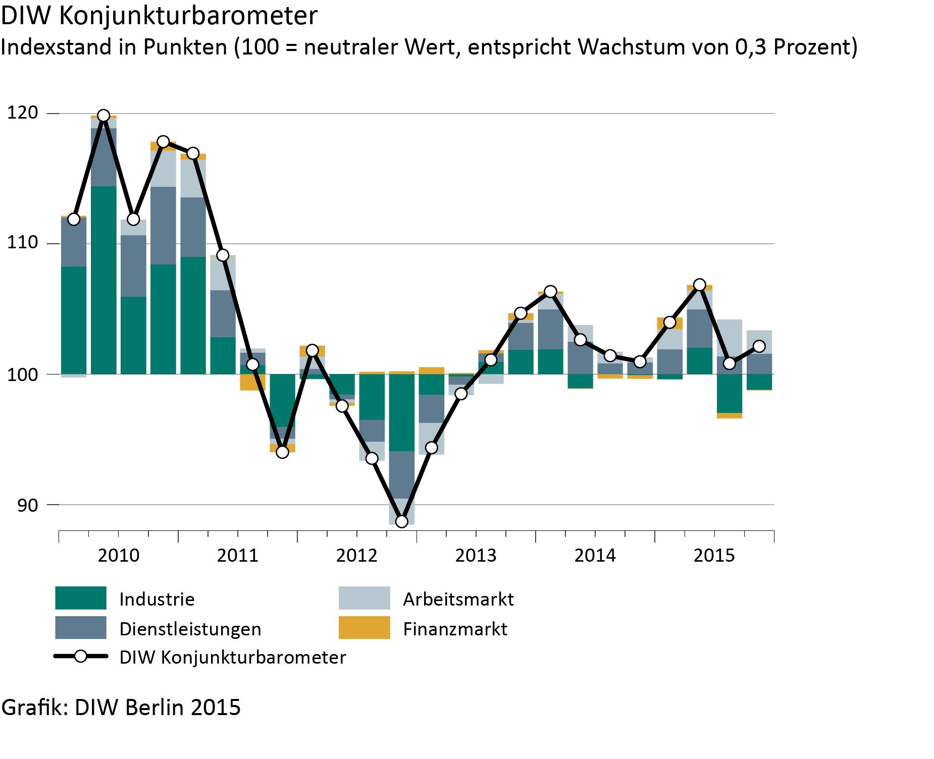 Die deutsche Wirtschaft dürfte im Schlussquartal moderat zulegen: Dem neuesten Konjunkturbarometer des Deutschen Instituts für Wirtschaftsforschung (DIW Berlin) zufolge wird das Bruttoinlandsprodukt gegenüber dem Vorquartal um 0,4 Prozent steigen. Der Indexstand liegt mit nun 102 Punkten weiterhin über dem Schwellenwert von 100 Punkten, der ein durchschnittliches Wachstum der deutschen Wirtschaft anzeigt, und auch über dem Wert für das dritte Quartal – im Vergleich zum Oktober ist er aber um einen Punkt gesunken. „Das verarbeitende Gewerbe kommt nach wie vor nur schwerfällig in Gang“, sagt DIW-Konjunkturchef Ferdinand Fichtner. „Zwar hat sich die Stimmung vor allem in den exportabhängigen Bereichen zuletzt aufgehellt, allerdings ist die Industrieproduktion in Deutschland rückläufig.“ Dies liegt vor allem daran, dass sich die Weltwirtschaft zuletzt eher enttäuschend entwickelt hat. Dennoch dürfte die globale Produktion ihren Aufwärtstrend insgesamt fortsetzen, was die deutschen Exporte zumindest insoweit beflügeln dürfte, dass die Industrieproduktion die Wirtschaft im Winter kaum noch dämpft.