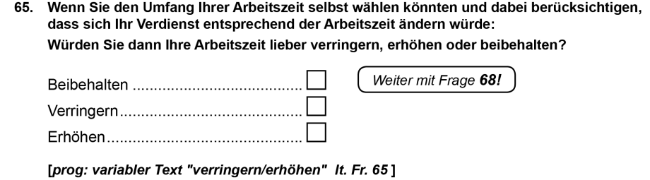 Im Mikrozensus wird Unter- und Überbeschäftigung auf Basis einer Filterfrage (Abbildung 1) ermittelt. Im SOEP wird dagegen Über- und Unterbeschäftigung als Differenz der tatsächlichen und gewünschten Arbeitszeit berechnet. (Zur Erfassung der tatsächlichen Arbeitszeit vgl. auch Kümmerling/Lazarevic 2016; Golden 2014; Schief 2003; Robinson/Chenu/Alvarez 2002; Robinson/Martin/Glorieux/Minnen 2011.)