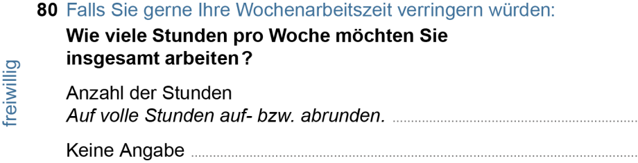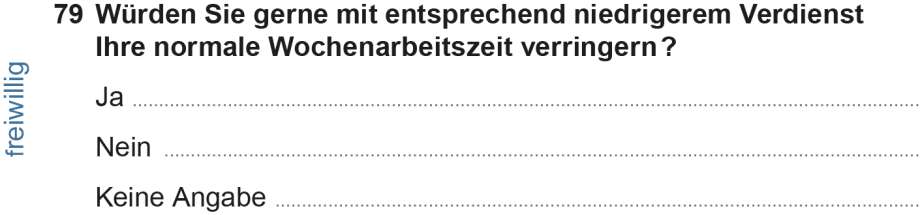 (2) Im SOEP sind alle Fragen freiwillig zu beantworten. Im Mikrozensus ist dagegen die Beantwortung meist obligatorisch, so auch die Frage nach der gewünschten Erhöhung der Arbeitszeit. Der Gesetzgeber hat für Merkmale, die ausschließlich aus der Europäischen Arbeitskräftestichprobe stammen, eine freiwillige Auskunftserteilung angeordnet (Statistisches Bundesamt 2016). Darunter fällt die Frage nach der gewünschten Verringerung der Arbeitszeit. 2014 übersprangen etwa ein Zehntel der Erwerbstätigen, die zu diesem Fragenkomplex geleitet wurden, die Frage (Holst/Bringmann 2016: 9f.). Inwieweit dies einen Effekt auf das Verhältnis von Über- und Unterbeschäftigten haben könnte, ist noch zu klären. Seit dem 1. Januar 2017 wird die Frage im Mikrozensus verpflichtend gestellt. Hieraus sind weitere Hinweise zu erwarten.