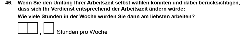 Zudem spielt eine Rolle, welche zeitlichen Bezüge Befragte bei der Angabe ihrer Arbeitszeitpräferenzen im Sinn haben. Im Mikrozensus wird dies teilweise mit der Frage, ob die Befragten in den kommenden zwei Wochen ihre Arbeitszeit erhöhen könnten (Frage 76, Statistische Ämter des Bundes und der Länder 2014), erfasst. Eine Analyse von offenen Angaben, die im FiD erhoben wurden, lassen jedoch die Interpretation zu, dass die Befragten eher mittel- oder langfristige Bezüge bei der Arbeitszeitverringerung herstellen (Holst/Bringmann 2016: 12f.). Sie nehmen möglicherweise lieber zukünftige als jetzige Einkommenseinbußen in Kauf (Golden 2014: 6).