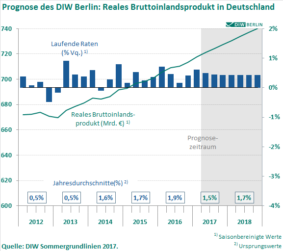DIW Berlin prognostiziert 1,5 Prozent Wachstum für dieses und 1,7 Prozent für kommendes Jahr – Stetiges Wachstum im vierten Jahr in Folge – Anzeichen für eine Überhitzung gibt es nicht – Euroraum erholt sich weiter – Globaler Aufschwung trotz Risiken