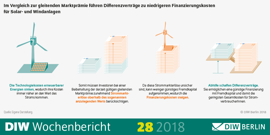 In einer neuen Studie untersuchen die Energieökonomen Karsten Neuhoff, Nils May und Jörn Richstein vom Deutschen Institut für Wirtschaftsforschung (DIW Berlin) anhand einer Simulation die Implikationen verschiedener Vergütungsoptionen. Sie kommen zu dem Schluss, dass mit der Einführung von Differenzverträgen (Contracts for Differences) bis 2030 etwa 800 Millionen Euro pro Jahr eingespart werden können. Eine fixe Marktprämie würde hingegen die Kosten für Stromkunden um jährlich 2,7 Milliarden Euro steigern. Ohne Vergütungsinstrumente würden die Kosten für erneuerbare Energien um rund 3,4 Milliarden Euro pro Jahr zulegen.