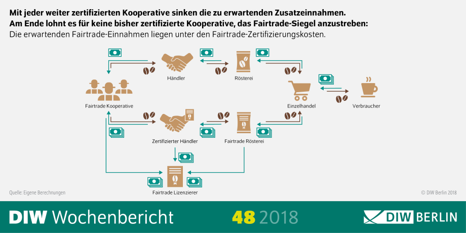 Fairtrade-Siegel sollen die Einkommen und Lebensbedingungen von ProduzentInnen erhöhen und so zu mehr Gerechtigkeit im internationalen Handel führen. Ökonomische Überlegungen und empirische Untersuchungen zeigen jedoch, dass dieses Ziel bei Kaffee nur eingeschränkt erreicht wird: Das Fairtrade-Siegel führt bestenfalls zu geringen Einkommenserhöhungen für die Kaffeebäuerinnen und -bauern. Auch hinsichtlich der Vorteile durch geringere Einkommensschwankungen, Zahlungen, die an die Umsetzung sozialer Projekte gebunden sind, sowie einem besseren Zugang zu Krediten sind die Ergebnisse gemischt. Für die Röstereien und Einzelhandelsunternehmen ist Fairtrade ein weiteres Mittel zur Marktsegmentierung.