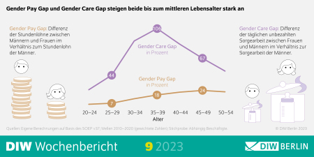Gender Pay Gap und Gender Care Gap steigen beide bis zum mittleren Lebensalter stark an