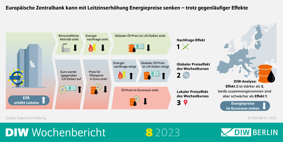 Neben dem Nachfrageeffekt, der den in Dollar gehandelten Ölpreis auf dem Weltmarkt infolge einer geringeren Energienachfrage senkt, spielen zwei Preiseffekte des Wechselkurses von Euro zu US-Dollar eine Rolle: Da im Zuge einer Zinserhöhung der EZB der Euro gegenüber dem US-Dollar aufwertet, verbilligen sich die Ölimporte im Euroraum. Da der günstigere Ölpreis in Euro dann aber wiederum die Nachfrage befeuert, steigt die Ölnachfrage auf dem Weltmarkt und damit der globale Ölpreis in US-Dollar. Dieser globale Preiseffekt ist stärker als der lokale Preiseffekt im Euroraum, sodass der stärkere Euro letztlich für einen höheren Ölpreis sorgt. Zusammengenommen ist der Preiseffekt des Wechselkurses mit seinem steigenden Ölpreis aber schwächer als der Nachfrageeffekt mit seinem sinkenden Ölpreis, sodass die Energiepreise unter dem Strich fallen.
