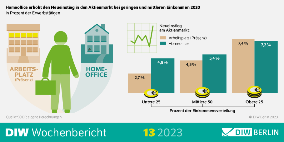 DIW-Studie auf Basis von SOEP-Daten zeigt: Homeoffice-Nutzung im Corona-Jahr 2020 hat Zahl der Aktionär*innen in Deutschland deutlich gesteigert – Aktienbesitz breiter über verschiedene Einkommensgruppen verteilt – Entwicklung hat Potenzial, Einkommens- und Vermögensungleichheit langfristig zu reduzieren