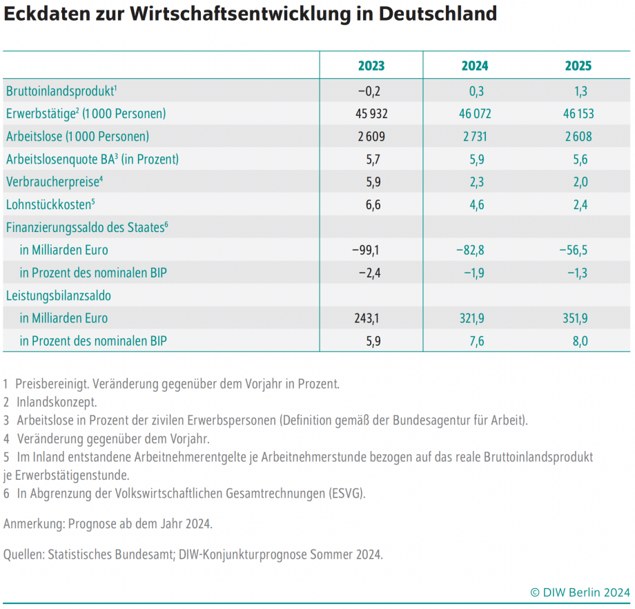 DIW Berlin erhöht Prognose für Wirtschaftswachstum im laufenden Jahr auf 0,3 Prozent – Zuwachs von 1,3 Prozent für 2025 erwartet – Kauflaune der privaten Haushalte verbessert sich – Restriktive Finanzpolitik belastet – Weltwirtschaft wächst mit Unterstützung der fortgeschrittenen Volkswirtschaften
