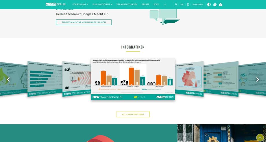 Die tollen Infografiken unser Grafiker*innen haben wir jetztweiter in den Mittelpunkt gerückt: Die Startseite des DIW-Webauftritts www.diw.de bietet mit einem sogenannten Karussell-Slider Einblick in die jeweils letzten 52 Bilder.
